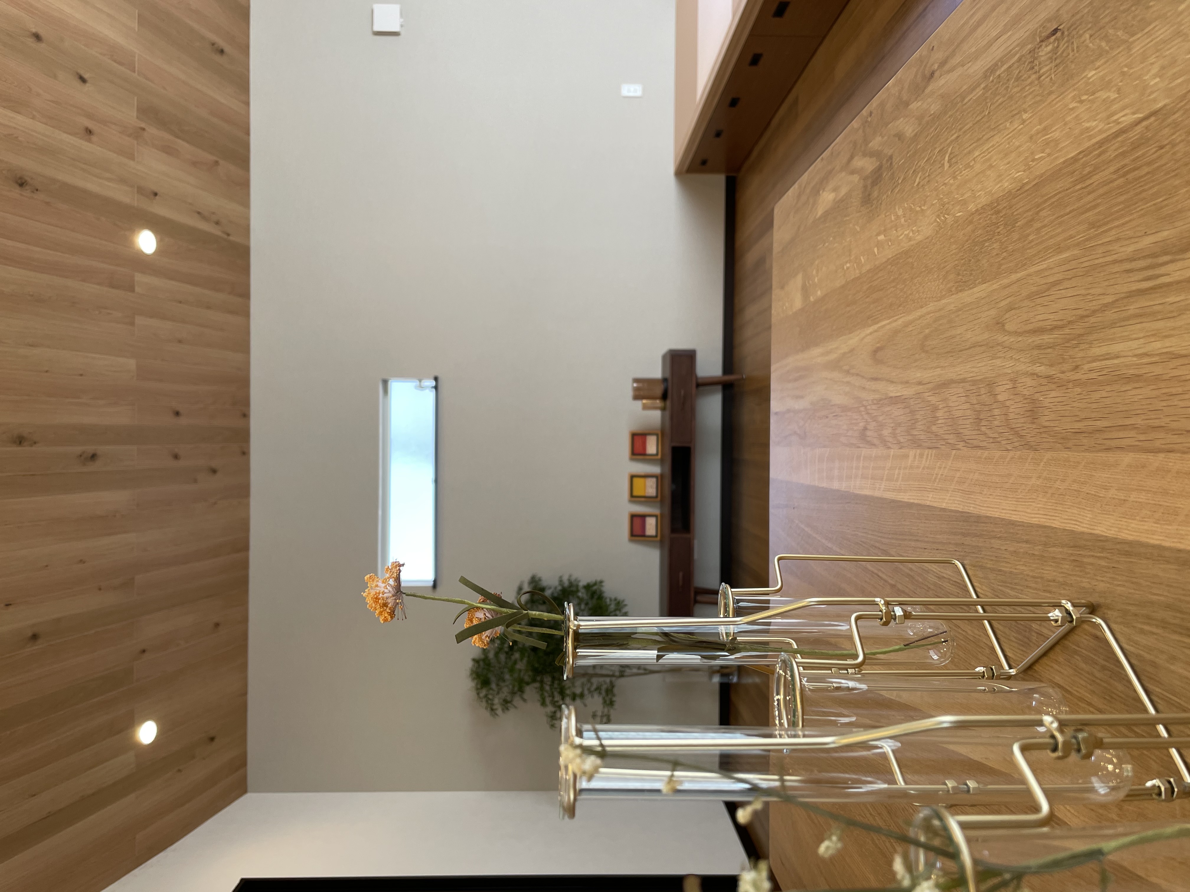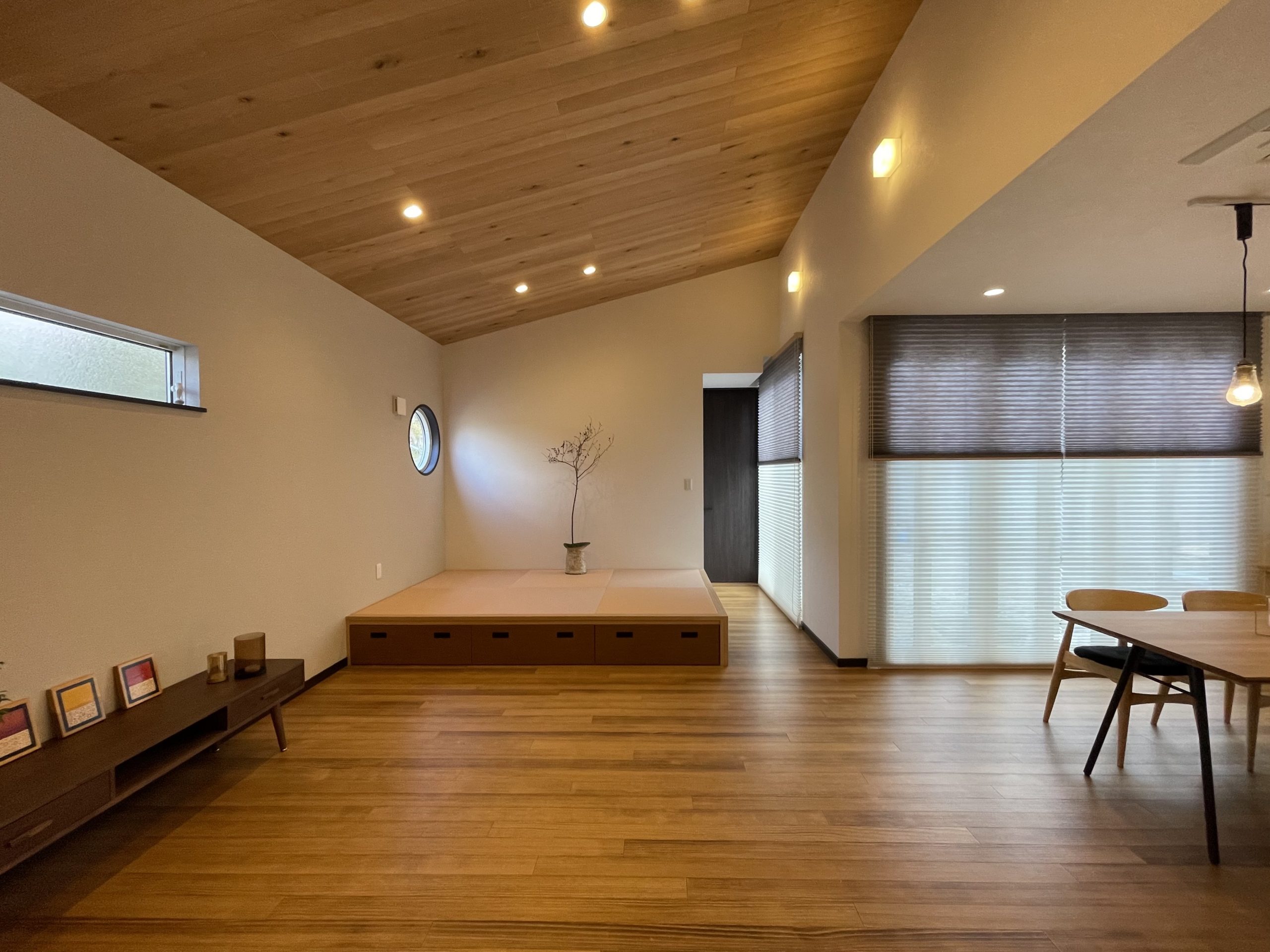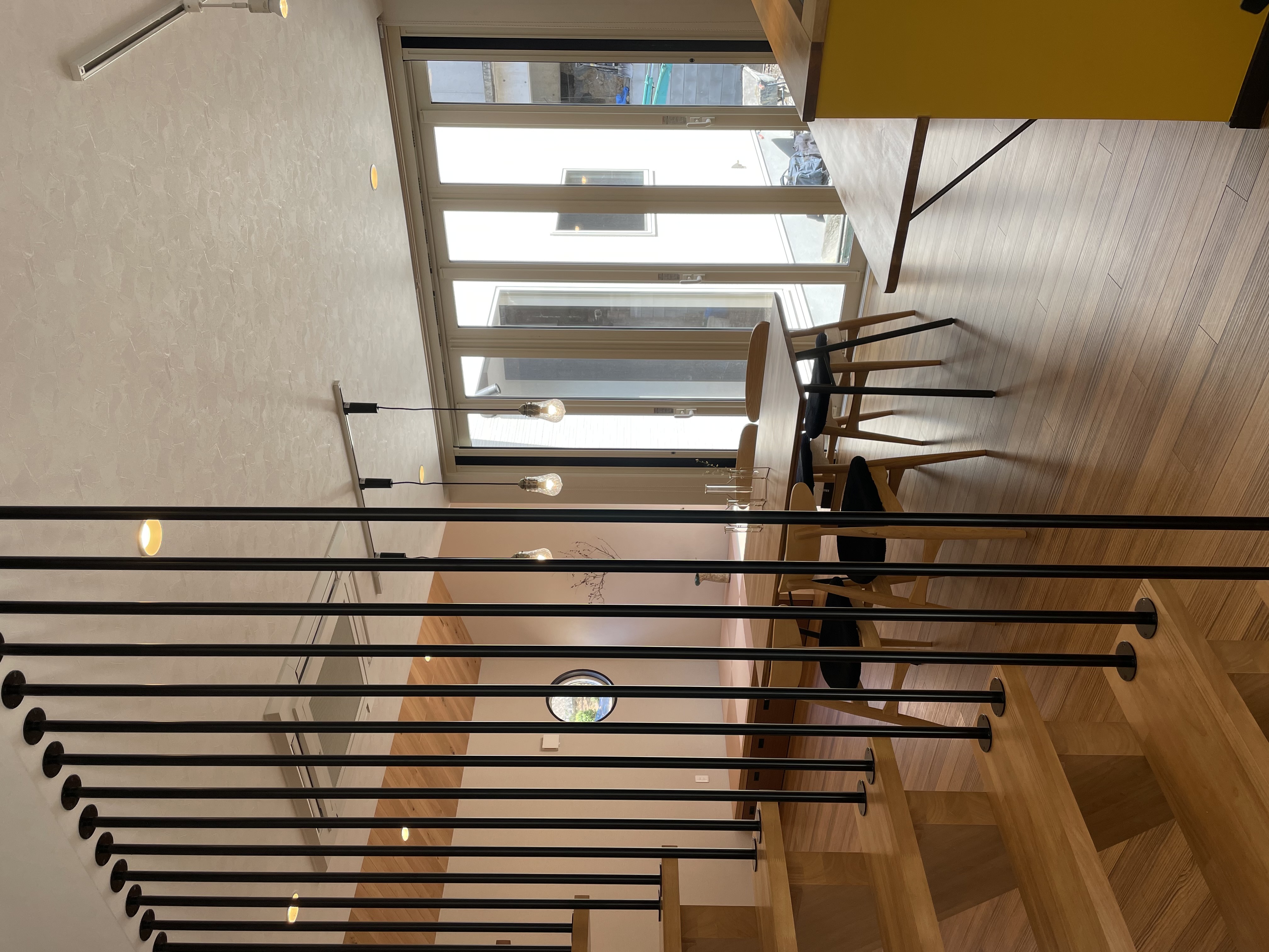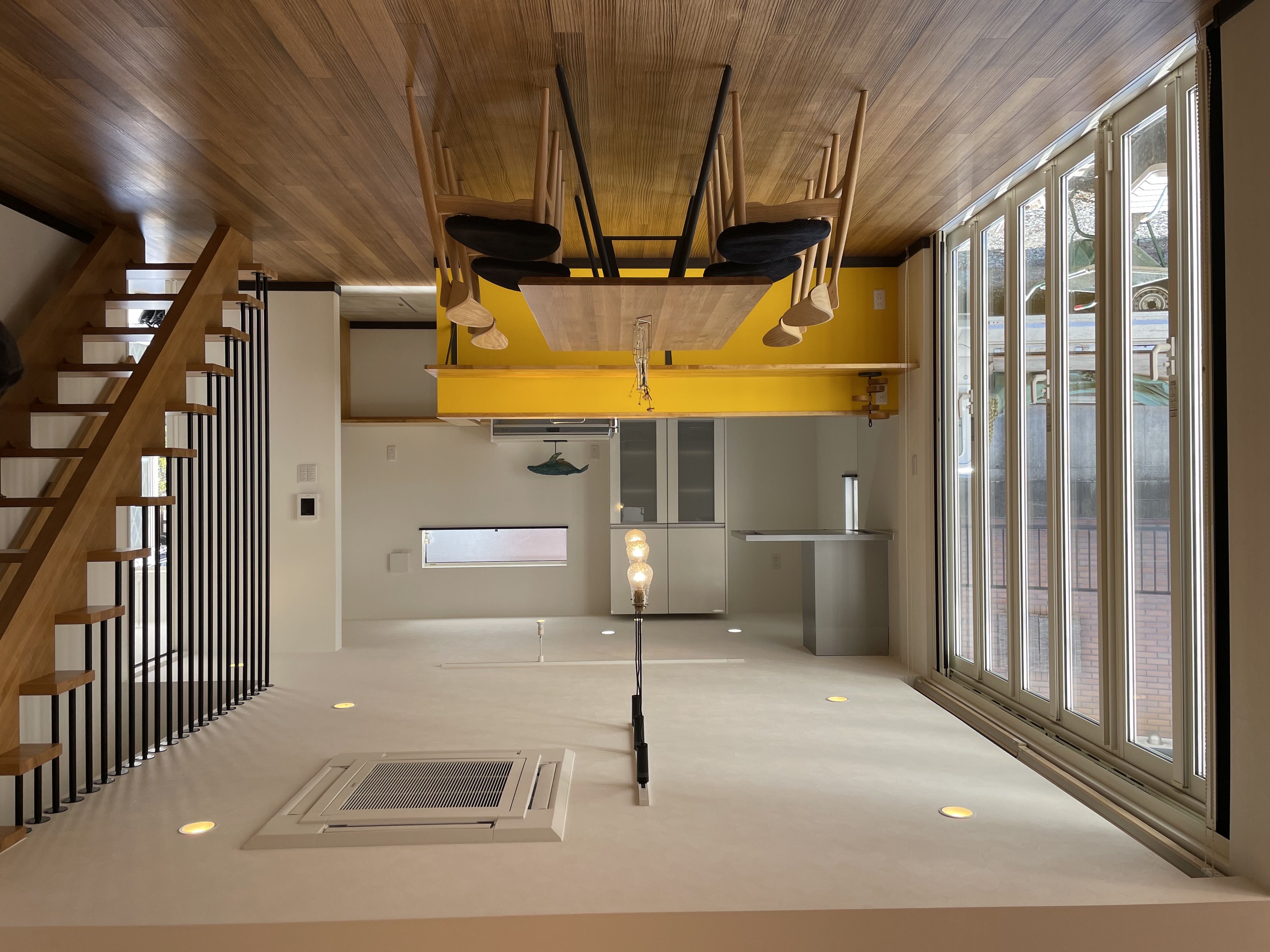 南東側に敷地の高い隣家があり、間取りでかなり悩まれていましたが、L字型のリビングをとることで明るさもプライベート空間もしっかりと確保できました。勾配天井の効果もありとても開放的な広々リビングです。全体的に明るめの色調でまとめて、その中にある階段のアイアンやキッチンの黄色い腰壁がアクセントになっています。小上がりでゴロンと、お昼寝も気持ちよさそうです。
