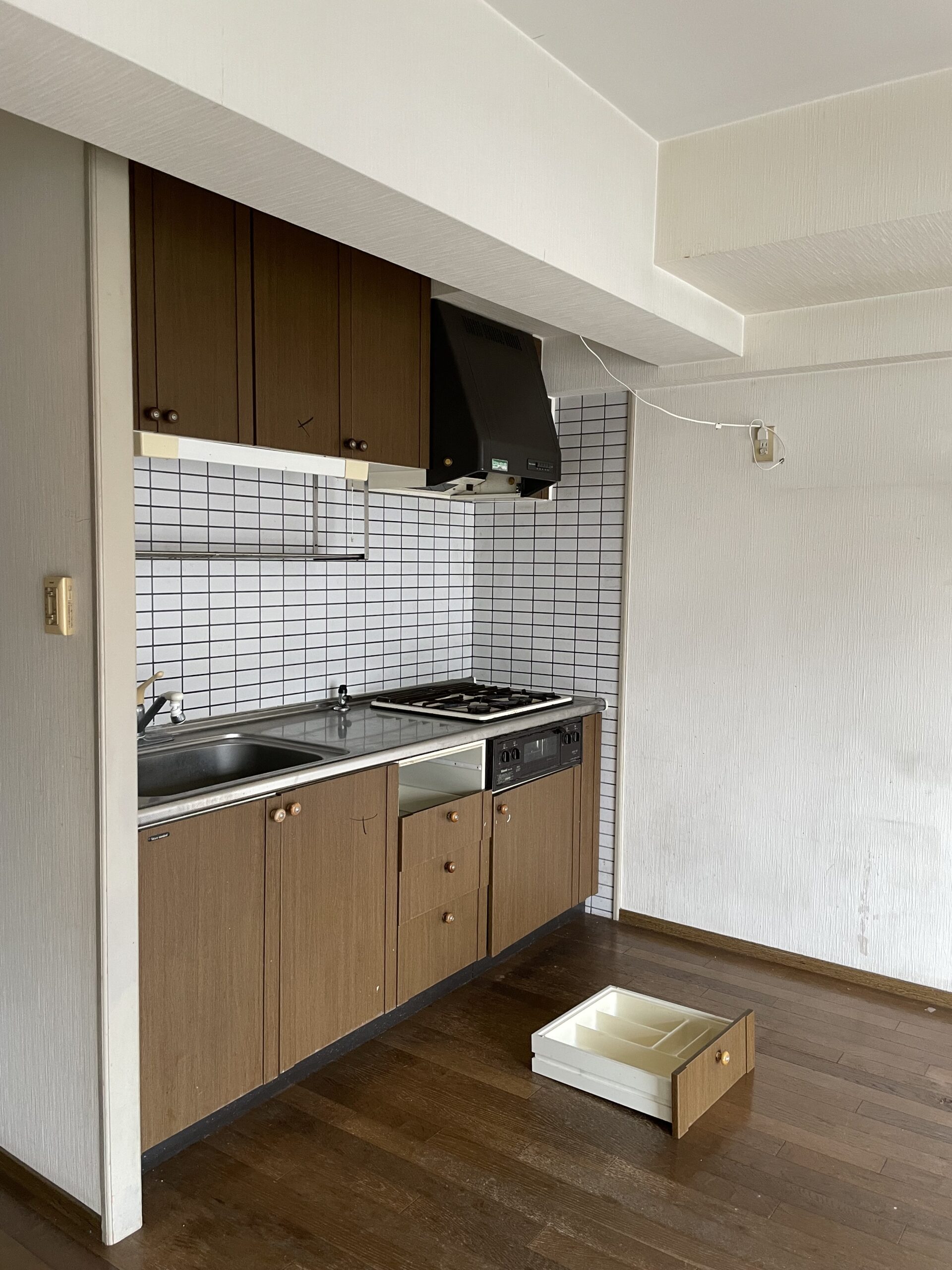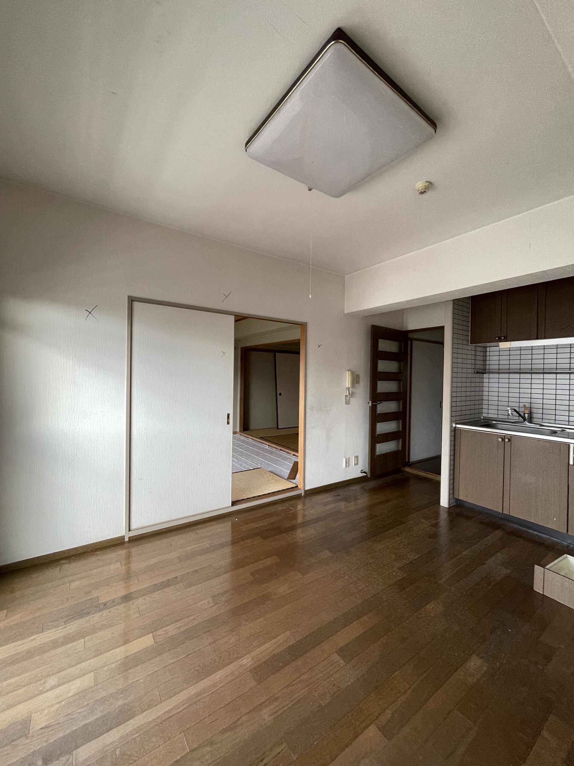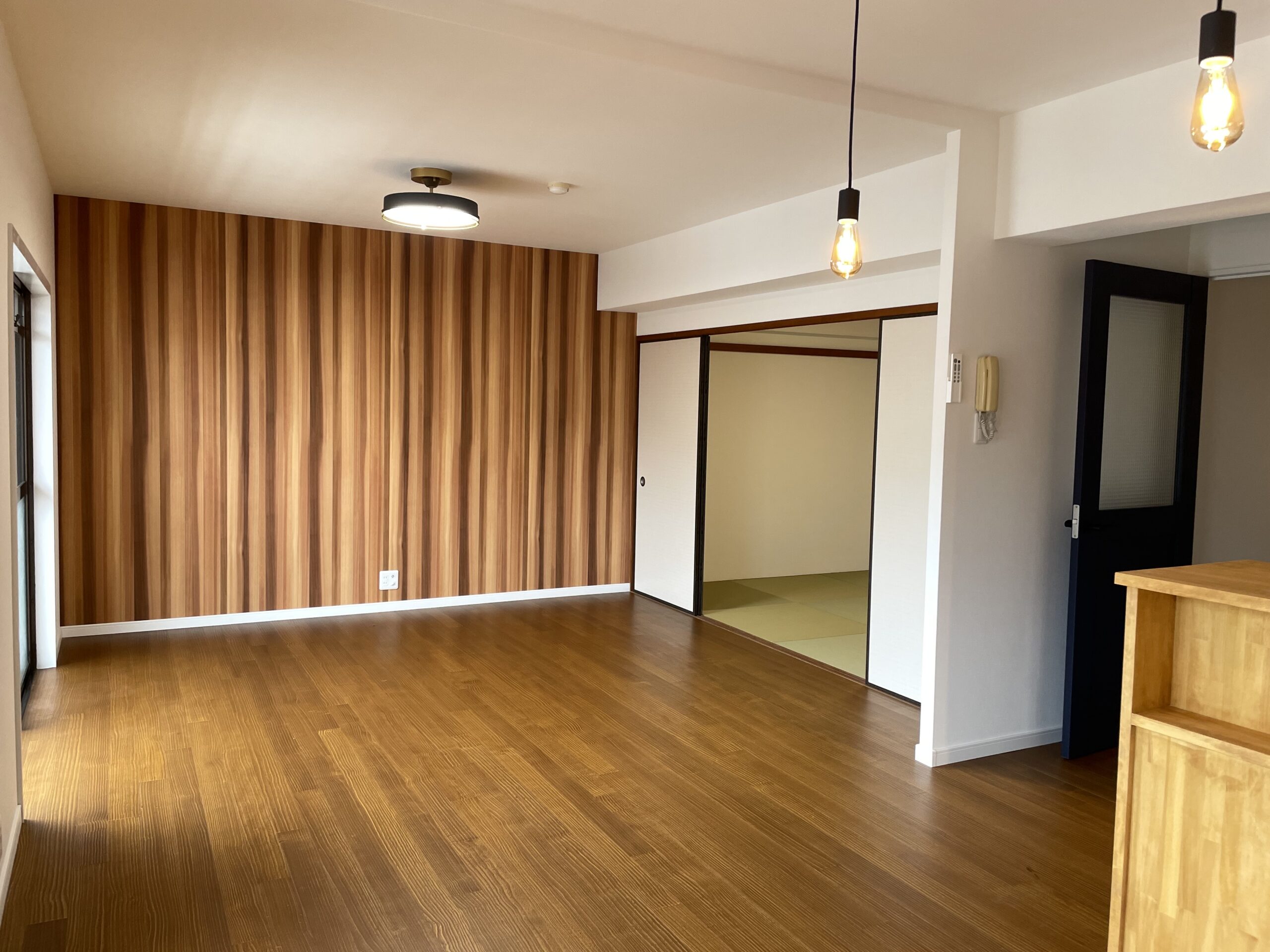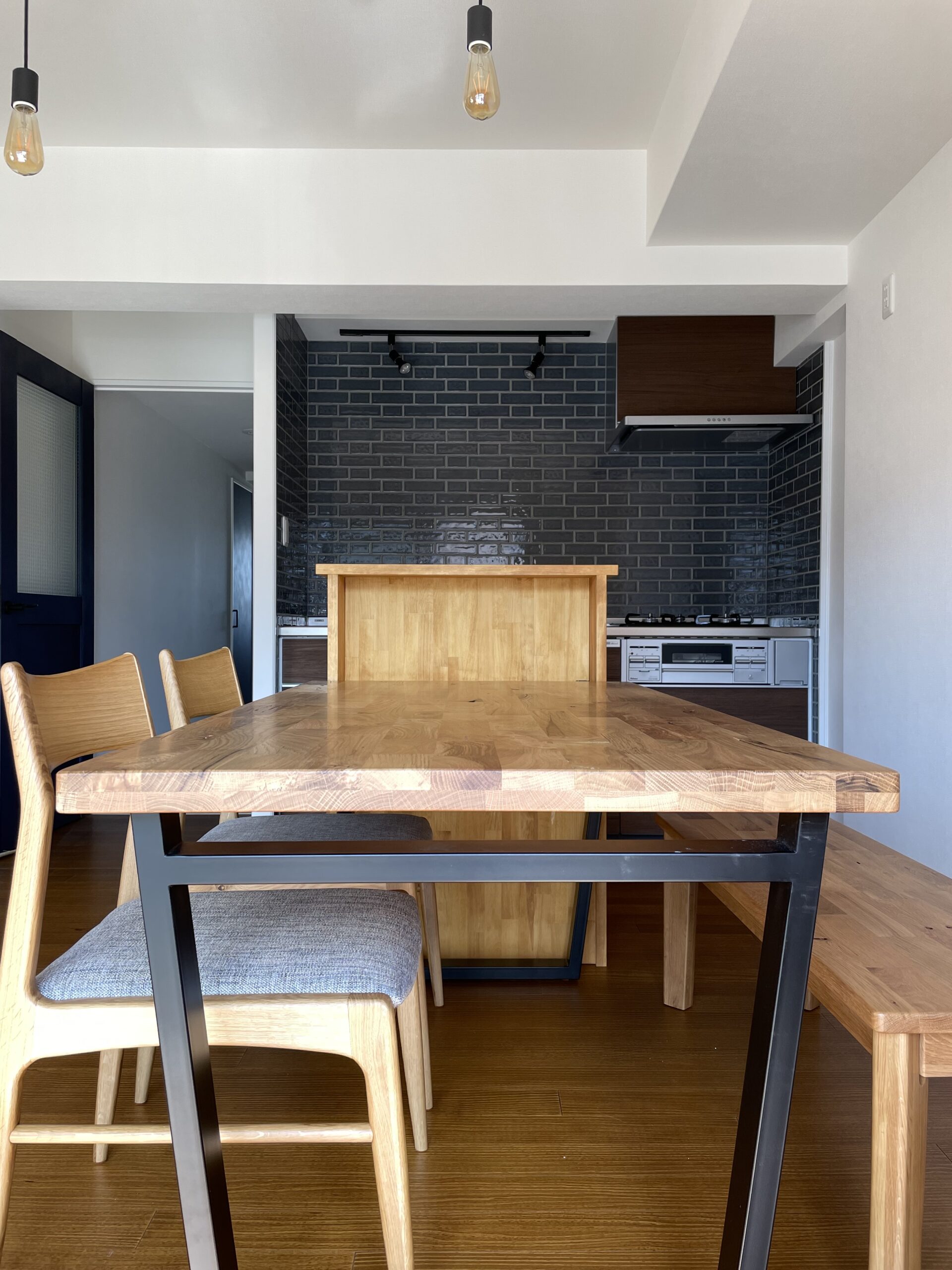 北九州市八幡東区のマンションショールームです。キッチンダイニングが狭かったので、となりにあった和室をリビングとして繋げました。リビング正面の壁は木を貼ったように見えますが、とてもよくできたビニルクロスです。キッチンは壁付けのまま新しくサブウェイタイルを貼り、テーブルとの間にカウンターを造作しました。配膳など食事の準備もスムーズに行えます。キッチン、トイレ、洗面、ユニットバスなど水回りを一新、4LDK→3LDKに間取り変更しました。