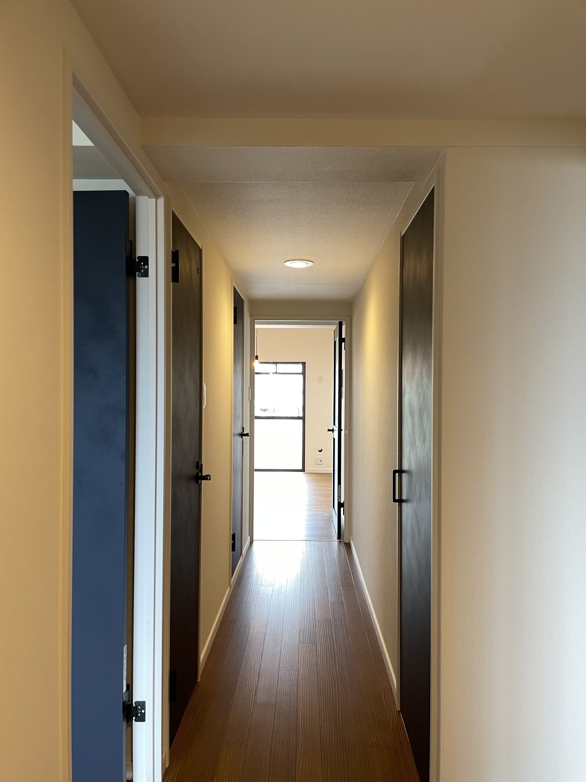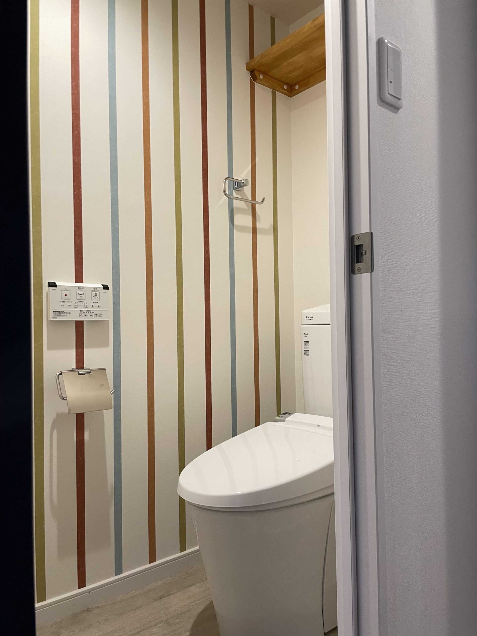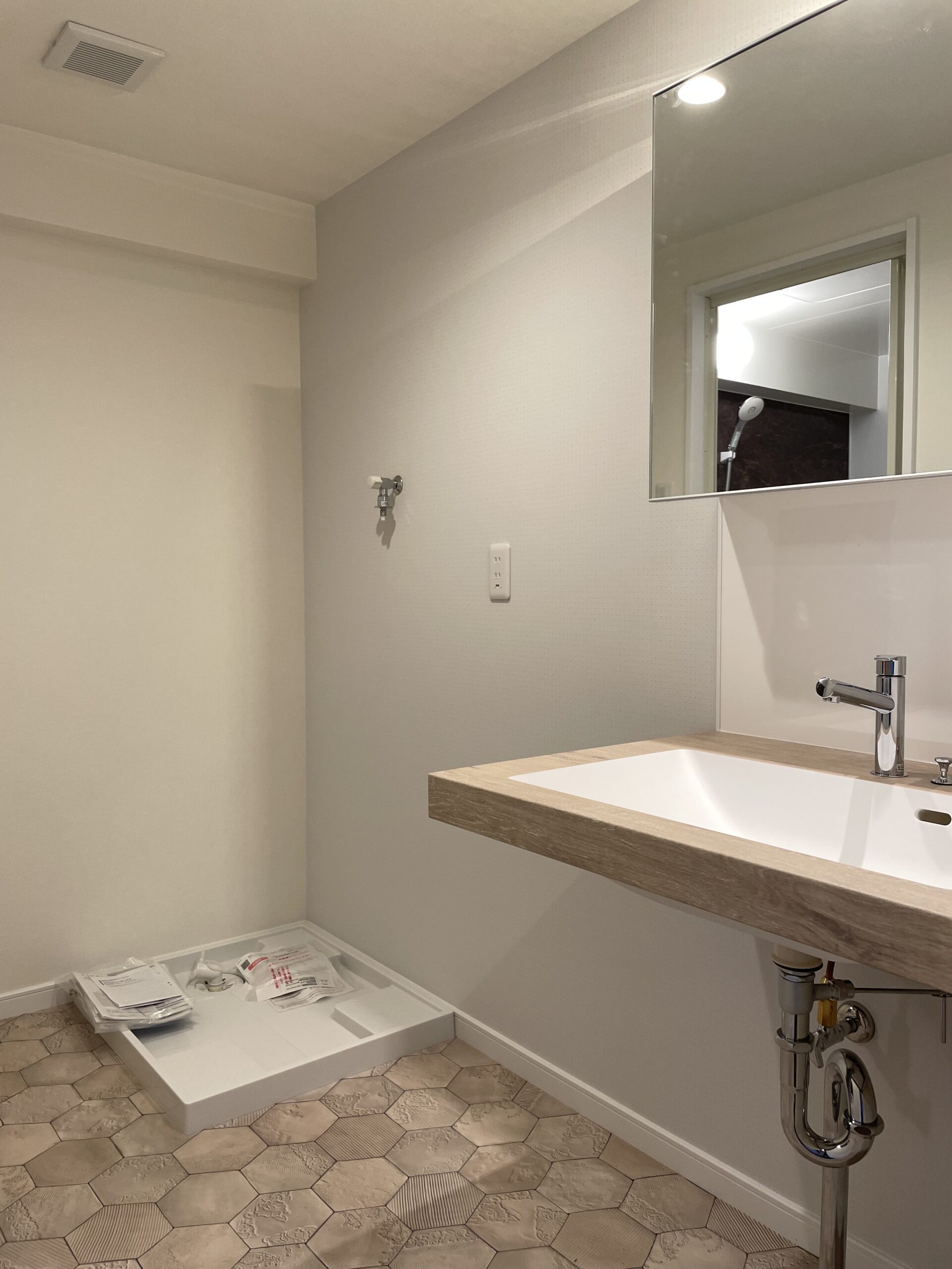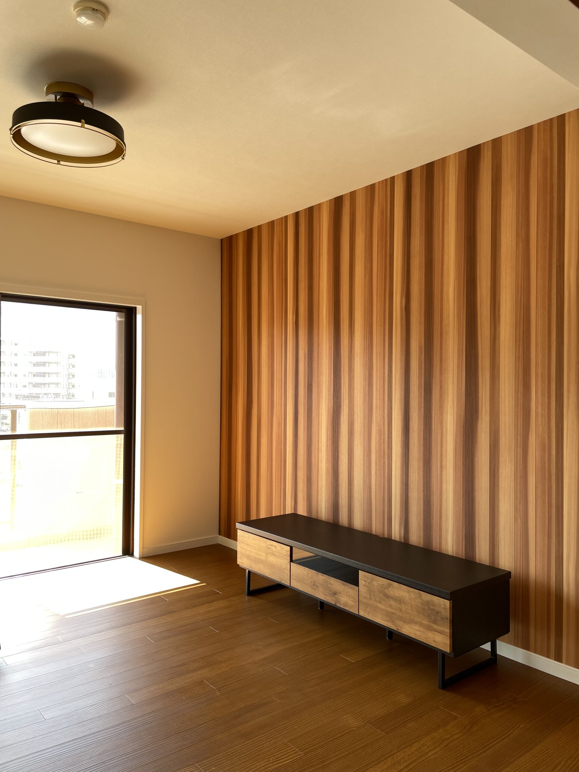 北九州市八幡東区のマンションショールームです。キッチンダイニングが狭かったので、となりにあった和室をリビングとして繋げました。リビング正面の壁は木を貼ったように見えますが、とてもよくできたビニルクロスです。キッチンは壁付けのまま新しくサブウェイタイルを貼り、テーブルとの間にカウンターを造作しました。配膳など食事の準備もスムーズに行えます。キッチン、トイレ、洗面、ユニットバスなど水回りを一新、4LDK→3LDKに間取り変更しました。
