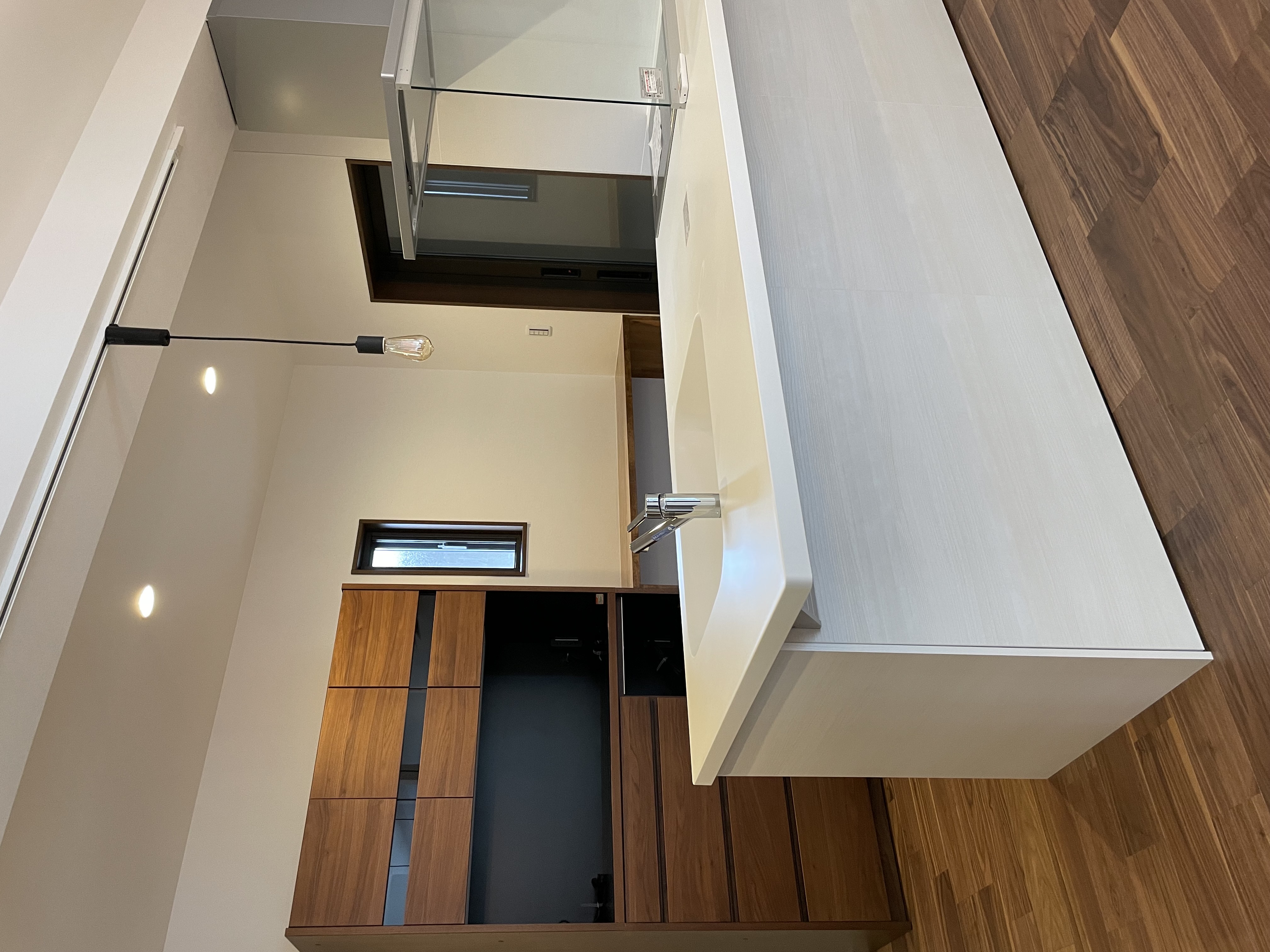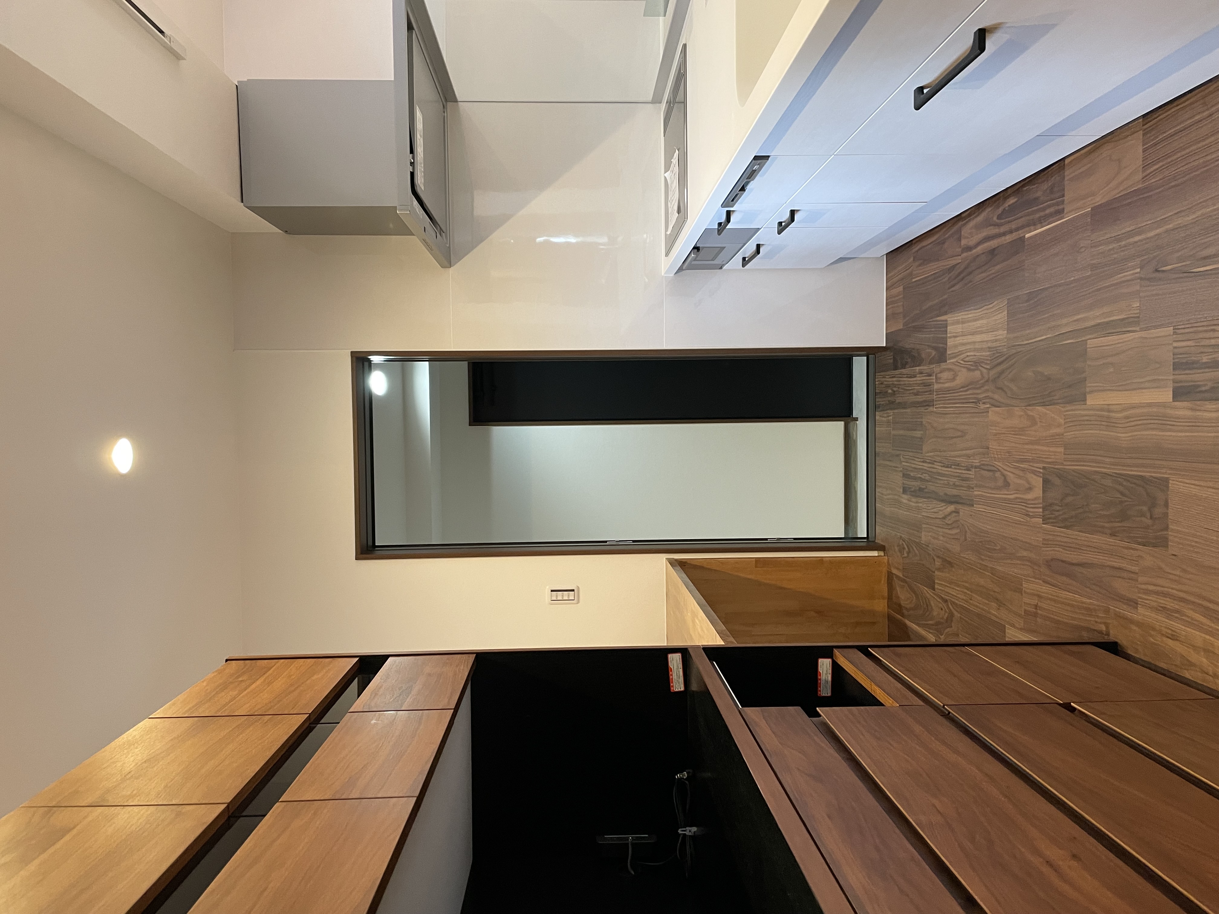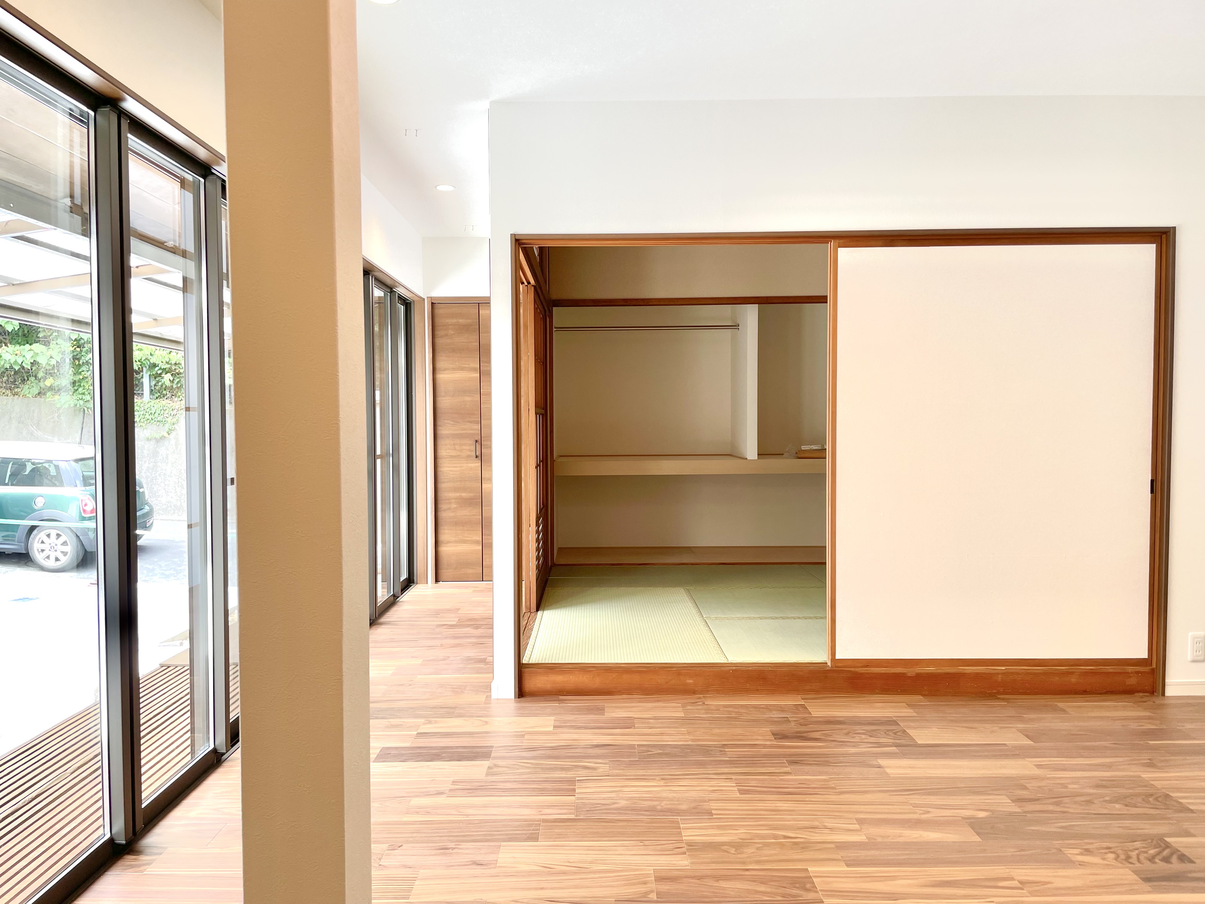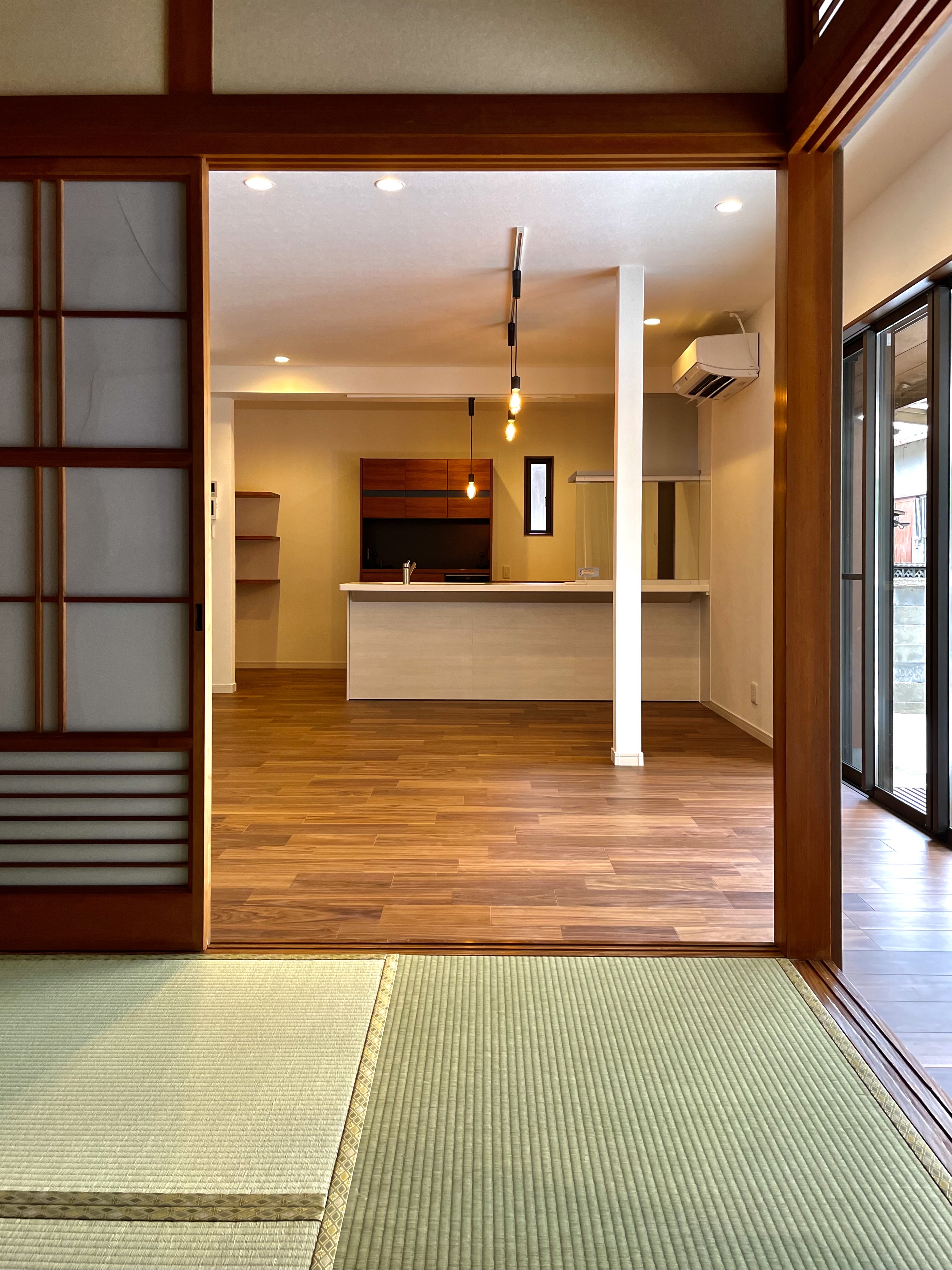 八幡西区で、平屋のリノベーションを施工させていただきました。元の建物がとても風格のあるいいお家で、そこを活かした形でというご相談をいただき工事をさせていただきました。細かく分断されて使い勝手の悪かった部屋は一つなぎにして、リビング横の和室はそのまま残しました。10cmほどの段差をあえて残すことで、この和室が少しだけ特別な雰囲気を出しています。南側のサッシは複層ガラスのサッシに入れ替え、コンクリートうちにした庭に向かって開放感があり、とても気持ちのいい空間となりました。
